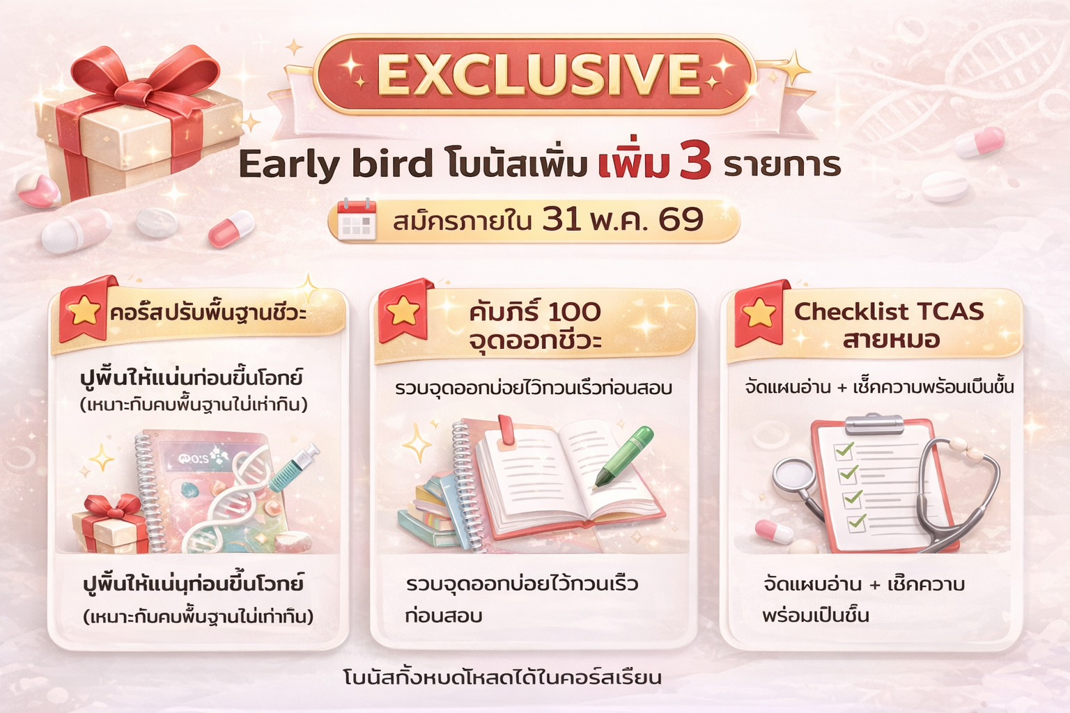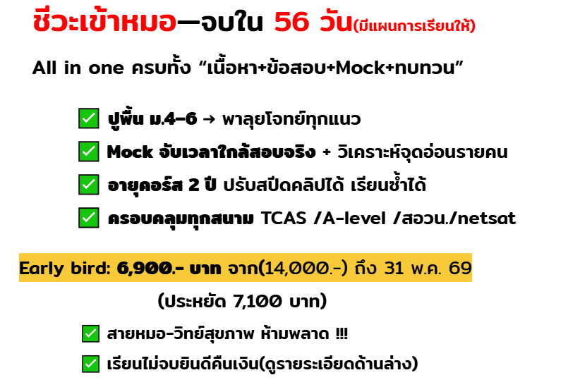 เหมาะกับน้อง ม.4–ม.6 ที่เตรียมสอบสายแพทย์–วิทย์สุขภาพ/คณะแข่งขันสูง และคนที่อยากเรียนให้ “ครบในคอร์สเดียว” (เนื้อหา + โจทย์ + Mock + ทบทวน)